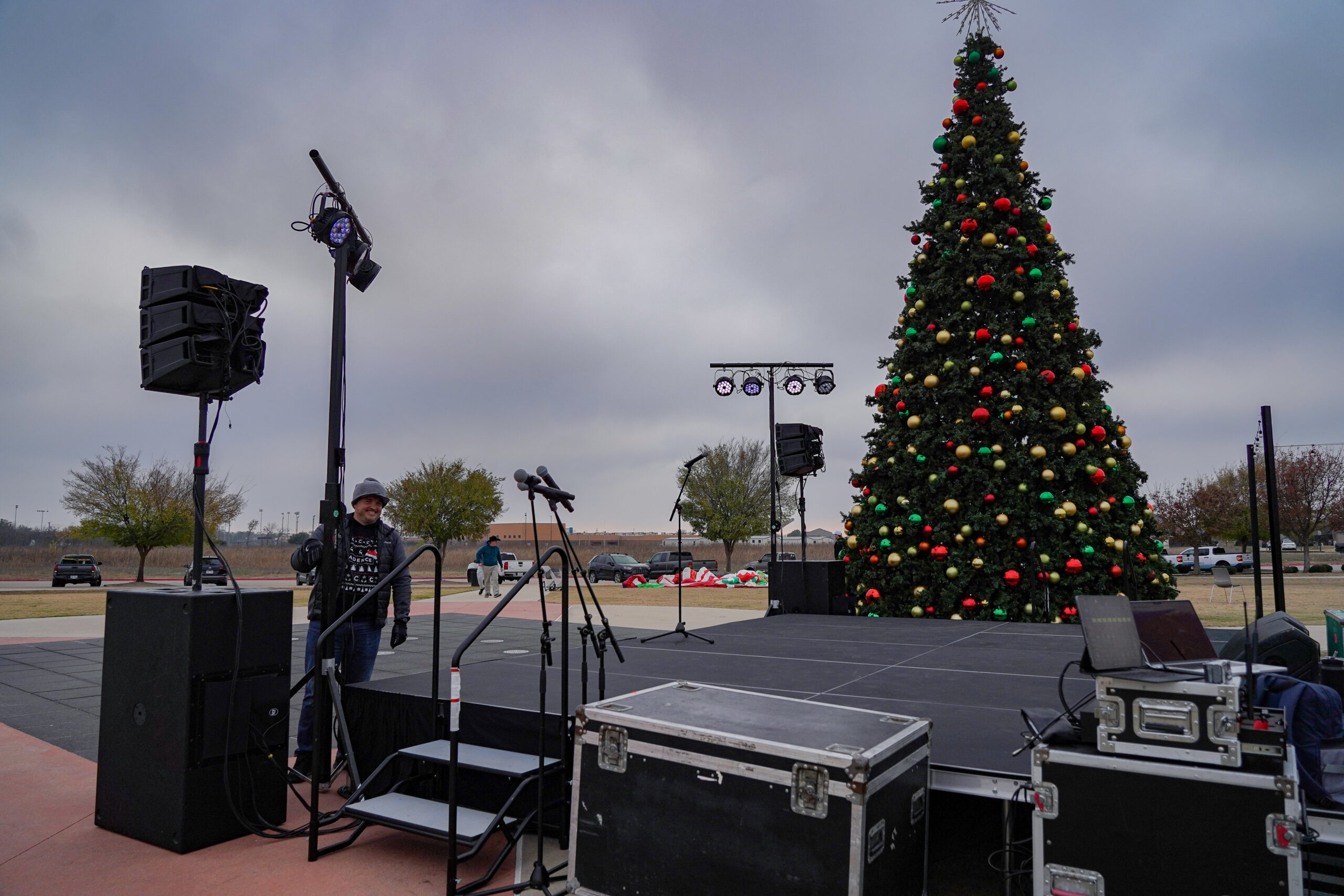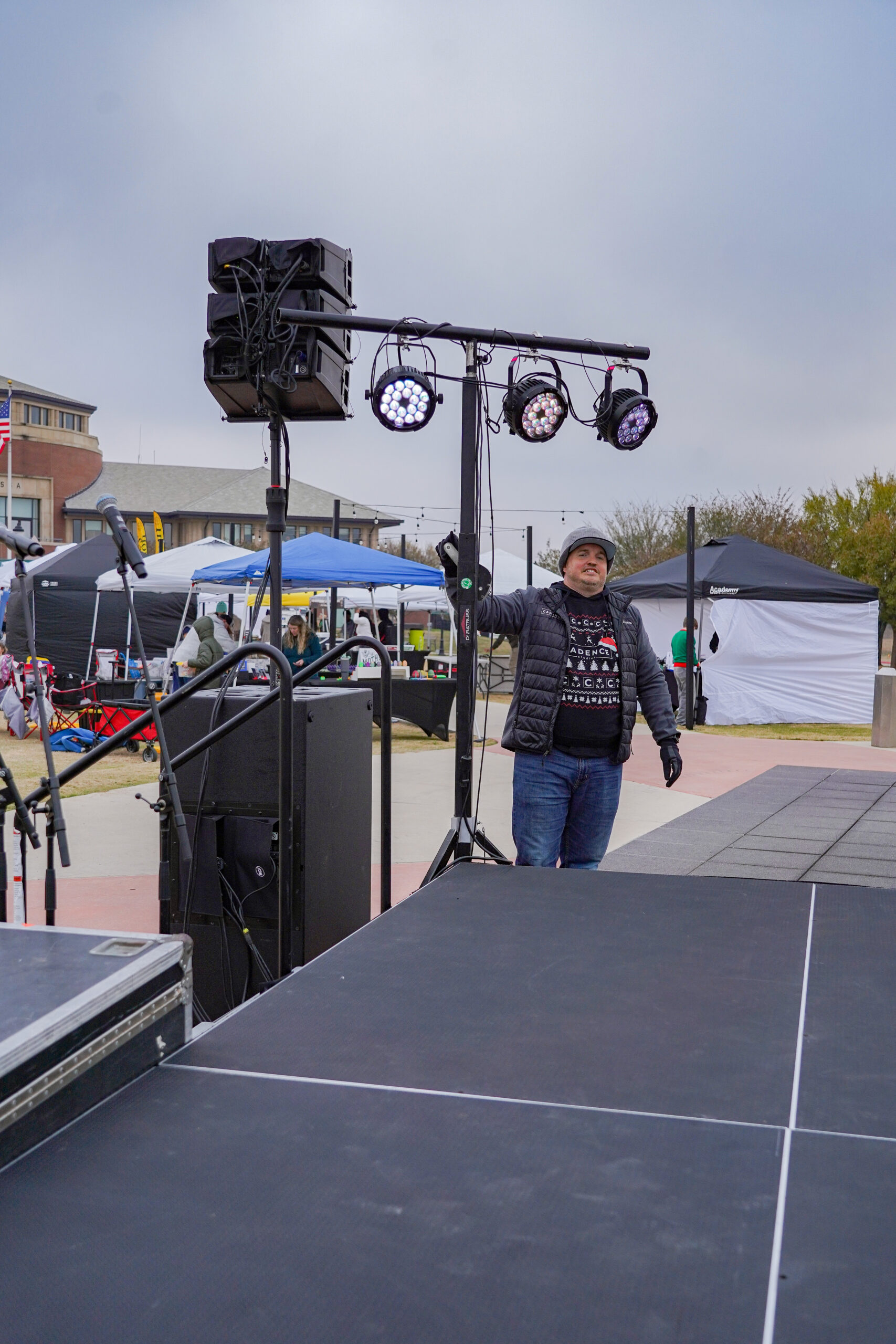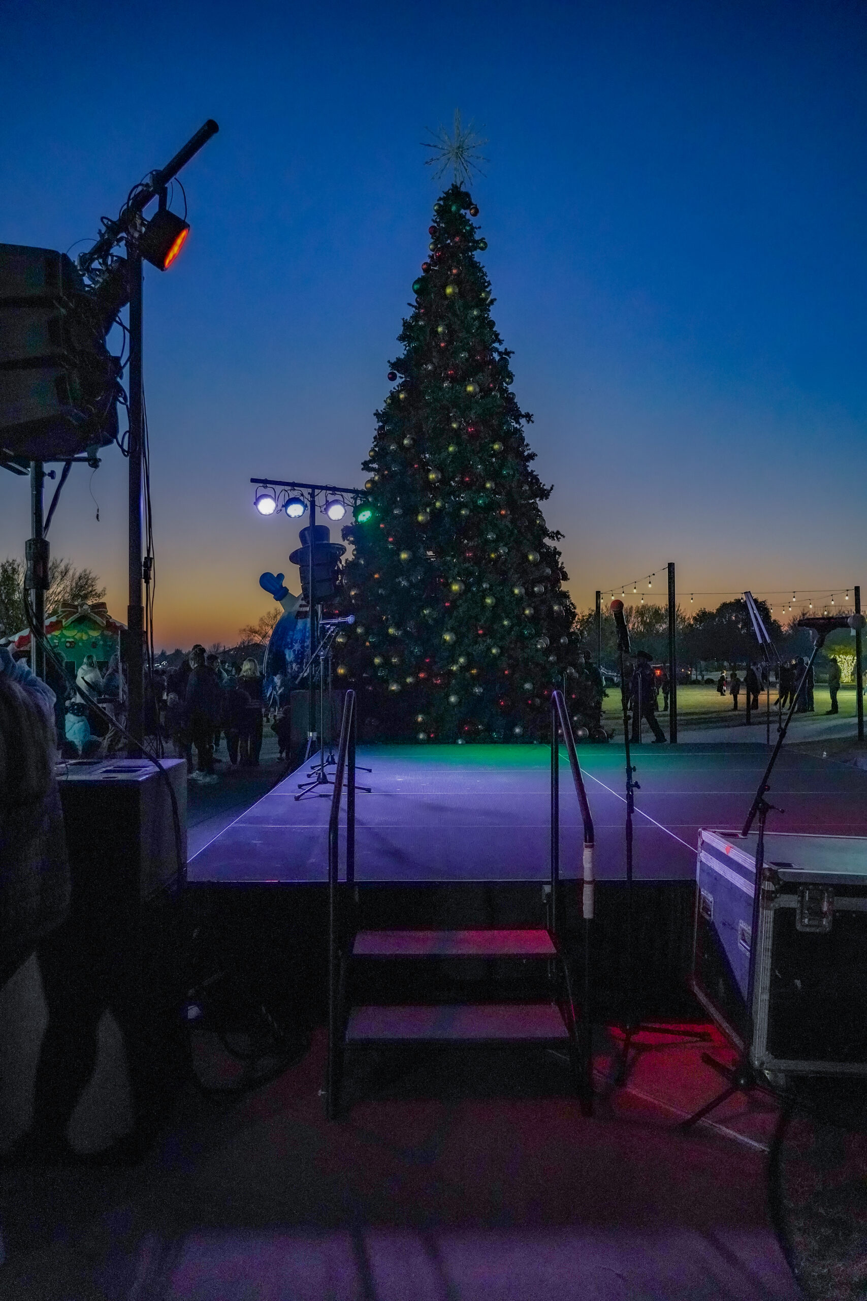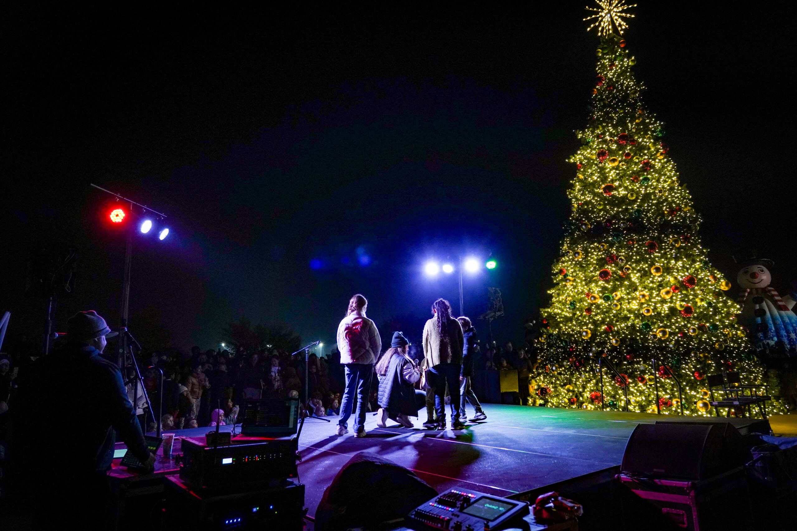 Cold, wet, and dark—outdoor winter events in North Texas present exactly the weather conditions that test equipment reliability and technical execution. Our stage, lighting, and sound systems needed to perform flawlessly in damp conditions while temperatures dropped throughout the evening. The lighting design had to work for both stage performances and the dramatic tree lighting moment, creating visibility for performers while contributing to the overall holiday atmosphere as darkness settled over the event. Audio coverage needed to reach families enjoying activities across a large outdoor space—from the holiday market to the snowball fight area—while maintaining clear intelligibility for poetry readings, choir performances, and the Mayor’s remarks. When you’re managing technical production for an event where hundreds of families with young children are experiencing holiday traditions, there’s no acceptable backup plan for equipment failure or inadequate coverage.