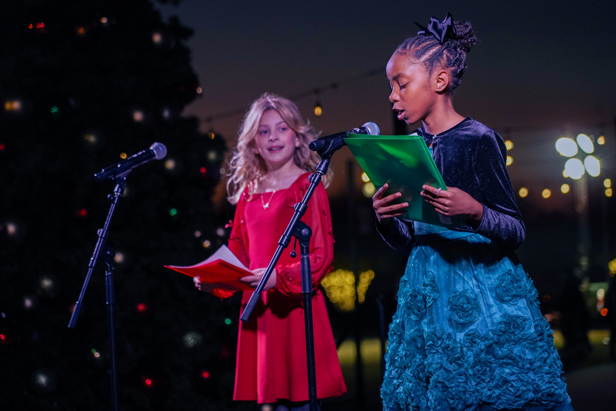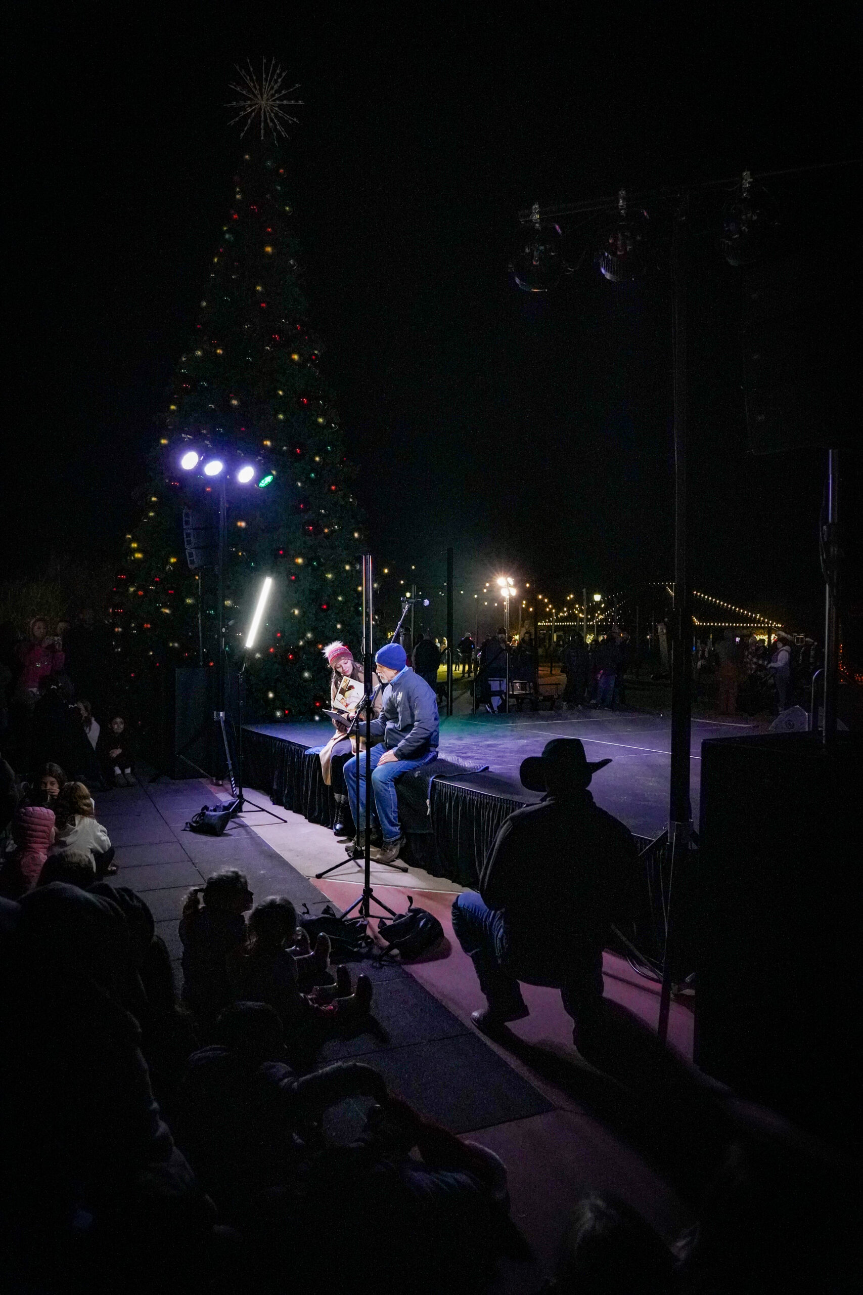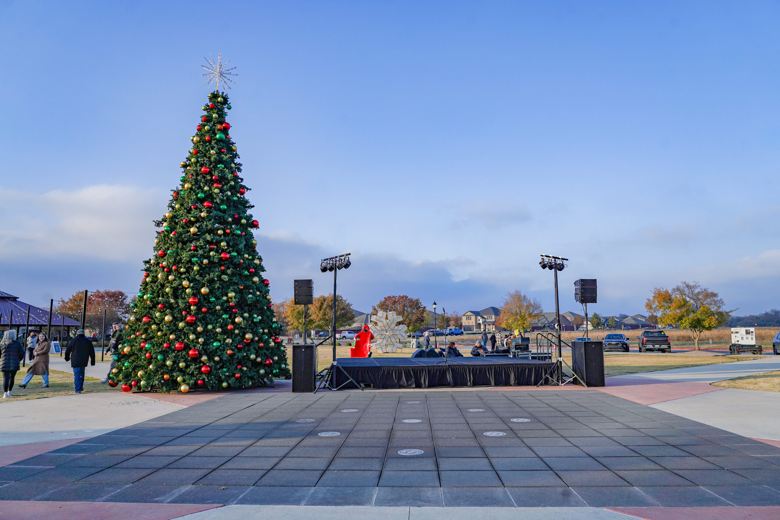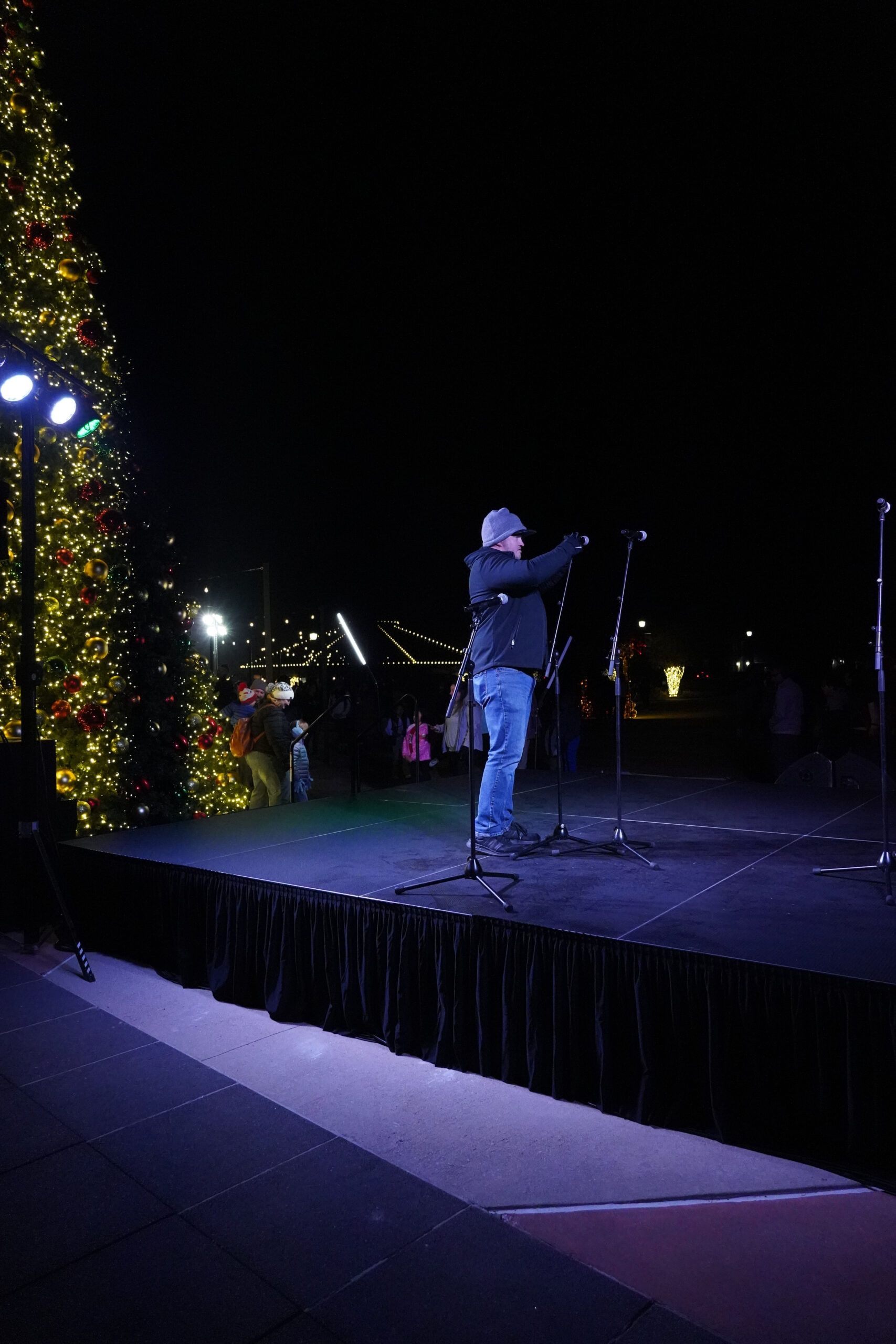 Cold, wet, and dark—outdoor winter events in North Texas present exactly the weather conditions that test equipment reliability and technical execution. Our stage, lighting, and sound systems needed to perform flawlessly in damp conditions while temperatures dropped throughout the evening. The lighting design had to work for both stage performances and the dramatic tree lighting moment, creating visibility for performers while contributing to the overall holiday atmosphere as darkness settled over the event. Audio coverage needed to reach families enjoying activities across a large outdoor space—from the holiday market to the snowball fight area—while maintaining clear intelligibility for poetry readings, choir performances, and the Mayor’s remarks. When you’re managing technical production for an event where hundreds of families with young children are experiencing holiday traditions, there’s no acceptable backup plan for equipment failure or inadequate coverage.
